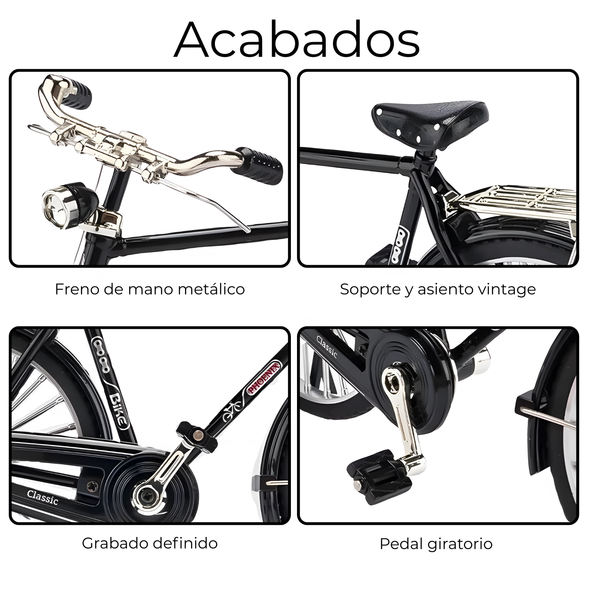Nuestra exclusiva Classic Bike, un modelo clásico para los amantes del estilo retro. Esta réplica en miniatura combina elegancia y durabilidad. Su diseño la convierten en una pieza ideal tanto para coleccionistas como para quienes buscan un artículo decorativo con carácter. Perfecta para exhibir en tu hogar, oficina o regalar a quienes valoran lo clásico y auténtico.